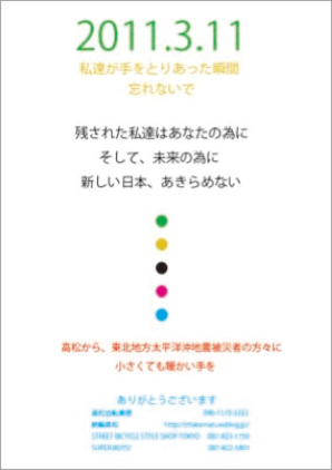 そして、私達ストリートバイシクルスタイルショップTOKYOは、高松自転車便、絶輪高松、SUPER BOY'S!と連動し、微力ながら今回の東北地方太平洋沖地震の被災者への義援活動プロジェクトを開始しました。